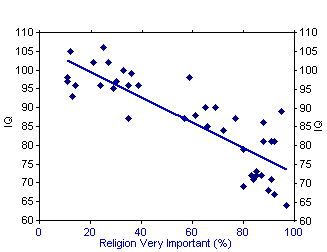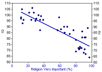Hace unos años, algunos investigadores aburridos decidieron trazar la importancia de la religión Vs. el CI de varios países en todas partes del mundo los resultados son completamente impresionantes (Ver la figura derecha), con un coeficiente de correlación de casi 0.9 (1.0 es perfecto). Así que, esto demuestra que la gente estúpida es atraída a las religiones, ¿verdad?
